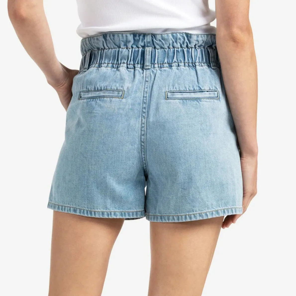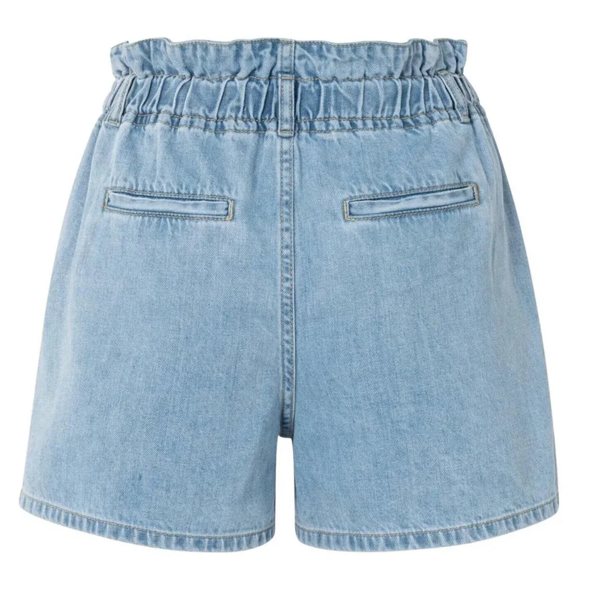 Der leichte Jeans Stoff in einem hellen Blau eignet sich perfekt für den Sommer. Sie hat einen hohen elastischen Bund mit Kordelzug und aufgesetzte Taschen auf der Vorderseite. Auf dem Gesäß sind Paspeltaschen angebracht.