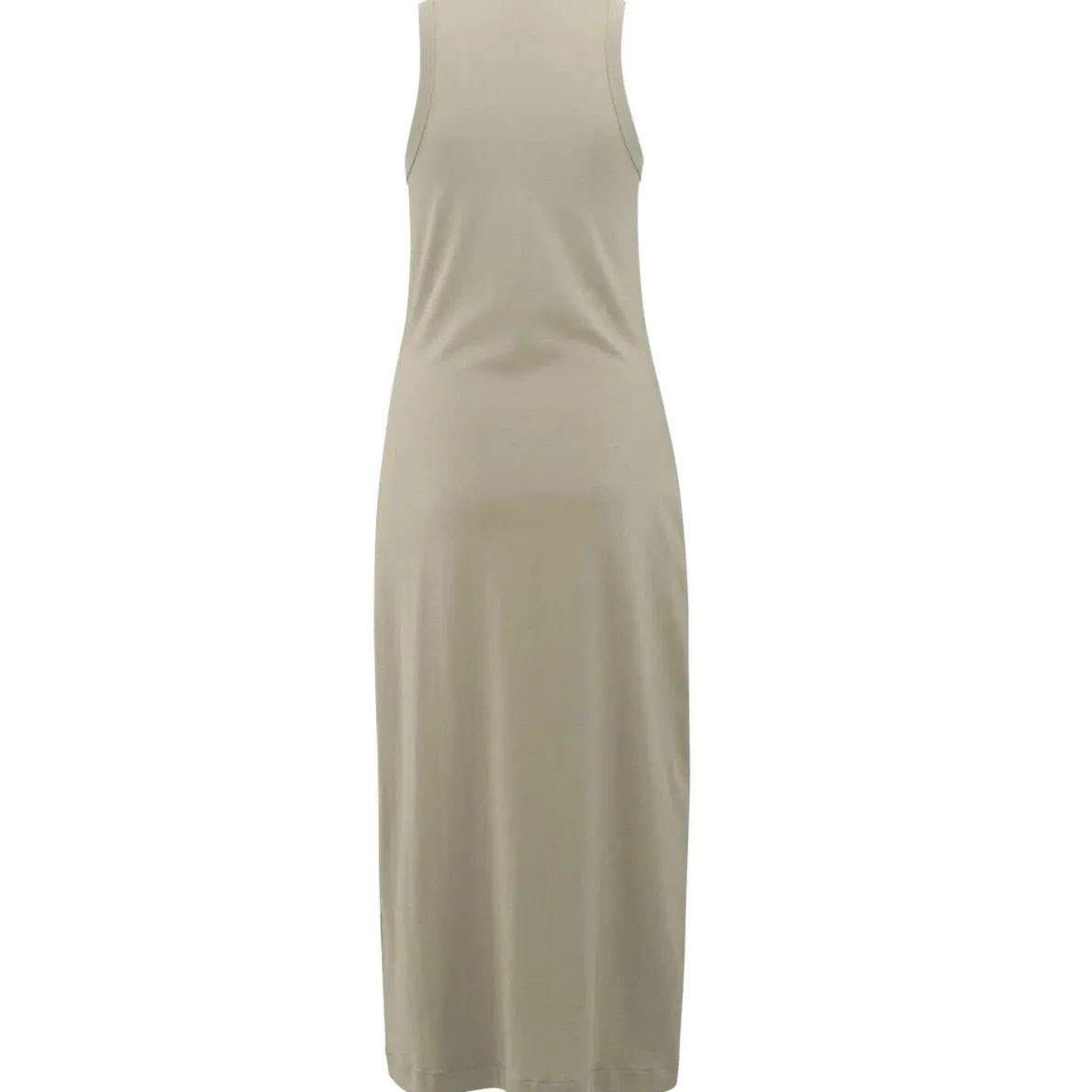 Es wurde aus reiner Baumwolle in Beige gefertigt. Es hat einen Rundhalsausschnitt und eine enge Passform. Auch hier findest du ein Knotendetail an der Taille. Es ist Ärmellos und hat die angesagte Midi Länge.