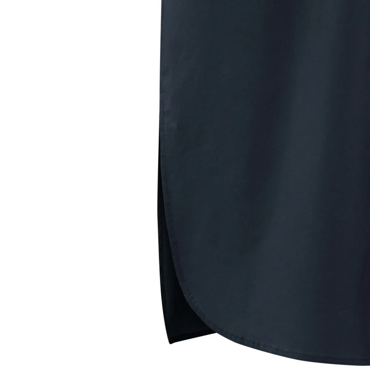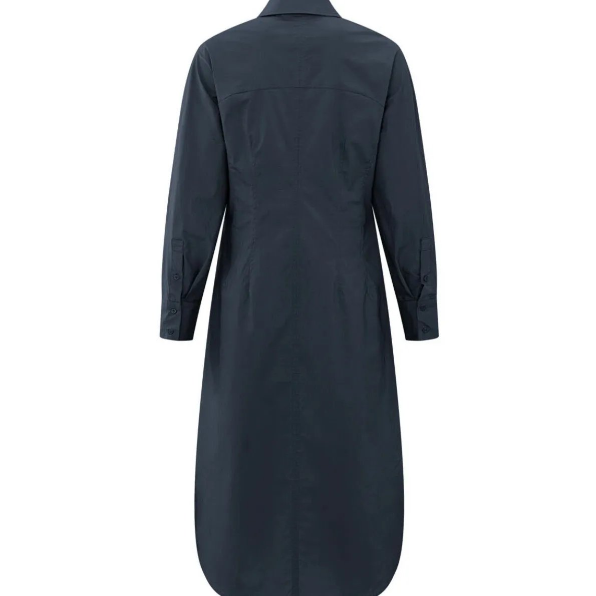 Der leichte und bequeme Stoff in Blau lässt sich angenehm tragen. Das Kleid hat einen klassischen Kragen, lange Ärmel und eine durchgehende Knopfleiste auf der Vorderseite. Dadurch kannst du es ganz individuell Tragen und einen unterschiedlichen Look gestalten. Durch die dezenten seitlichen Schlitte hast du genügend Bewegungsfreiheit. Die gekonnt gesetzt Taillierungsnähte zaubern eine tolle Passform.