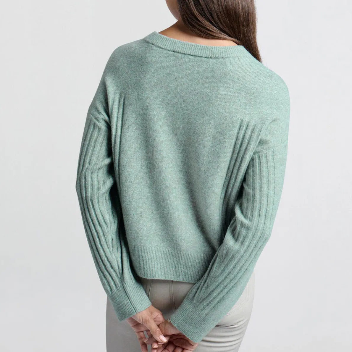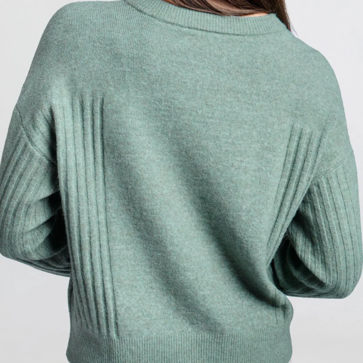 Er besteht aus einem weichen Stoff in Grün und hat eine schöne Rippverzierung an den Ärmeln und Seiten. Er ist im Loose Fit Schnitt gearbeitet und dadurch besonders angenehm zu tragen.