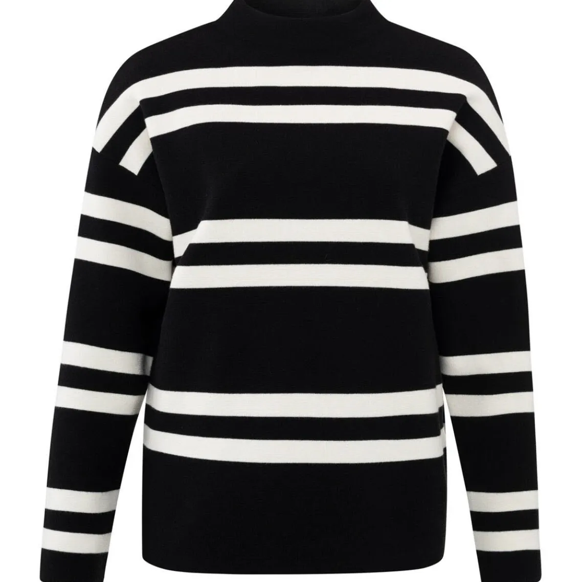 Das Strickgewebe in Schwarz mit Weiß, wurde als Blockstreifen gearbeitet. Er hat einen kleinen Stehkragen. lange Ärmel und eine lockere Passform und ist daher für gemühtliche Winter Tage super geeignet. Kombiniere ihn lässig mit einer Jeans und tollen Boots für den Winter.