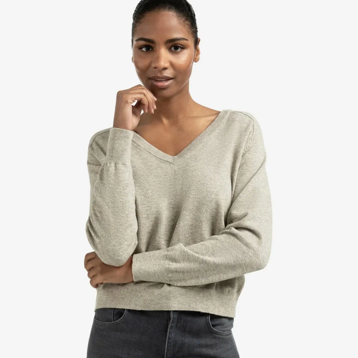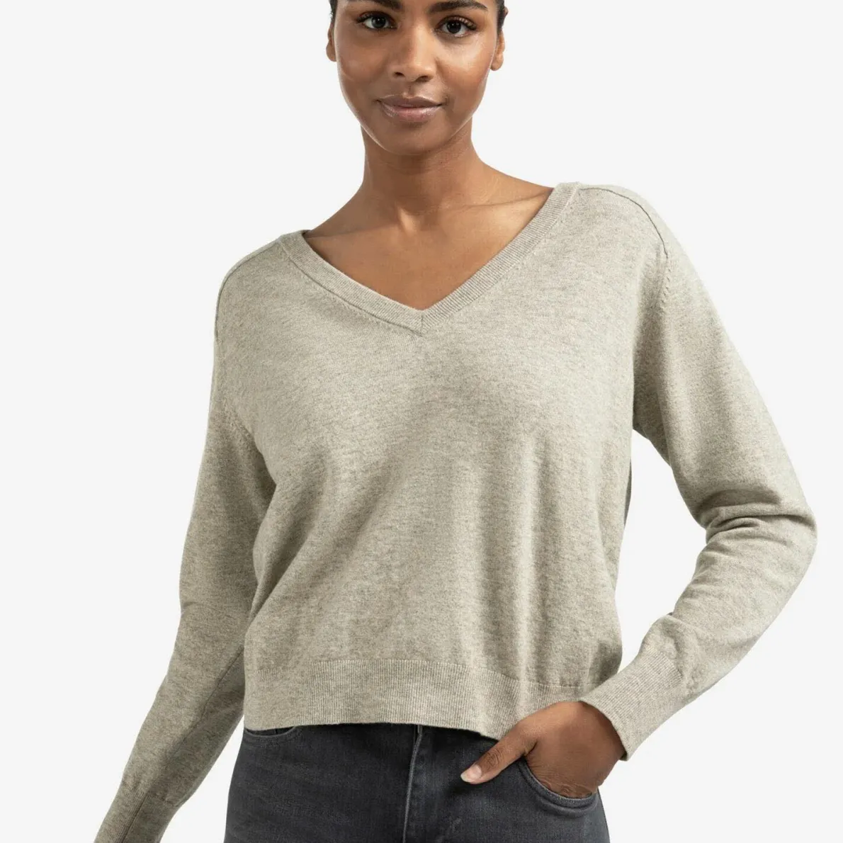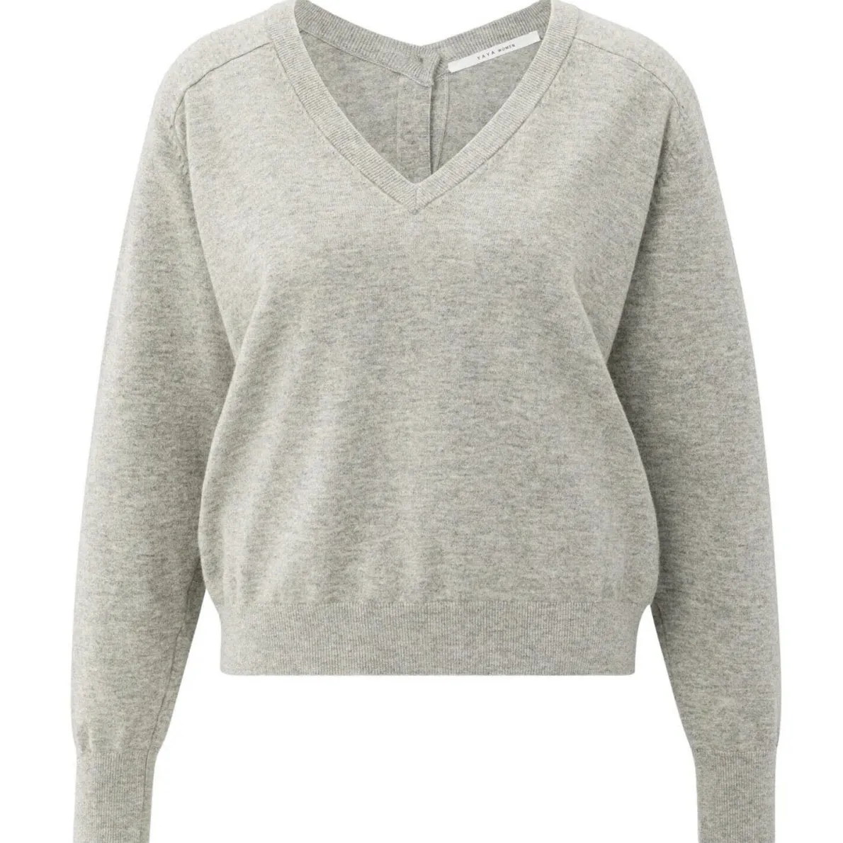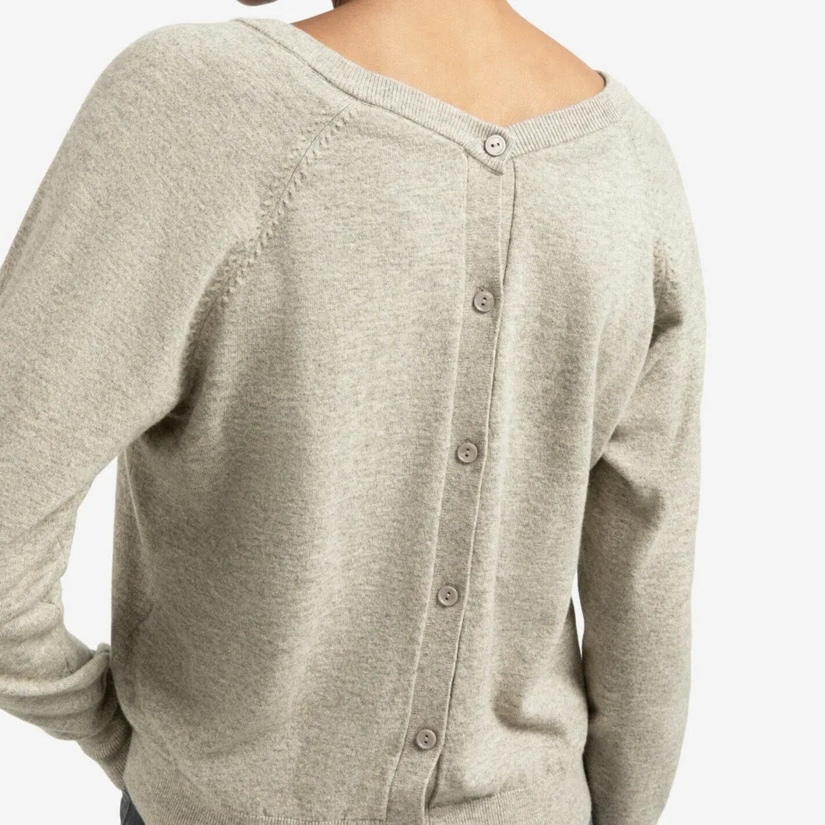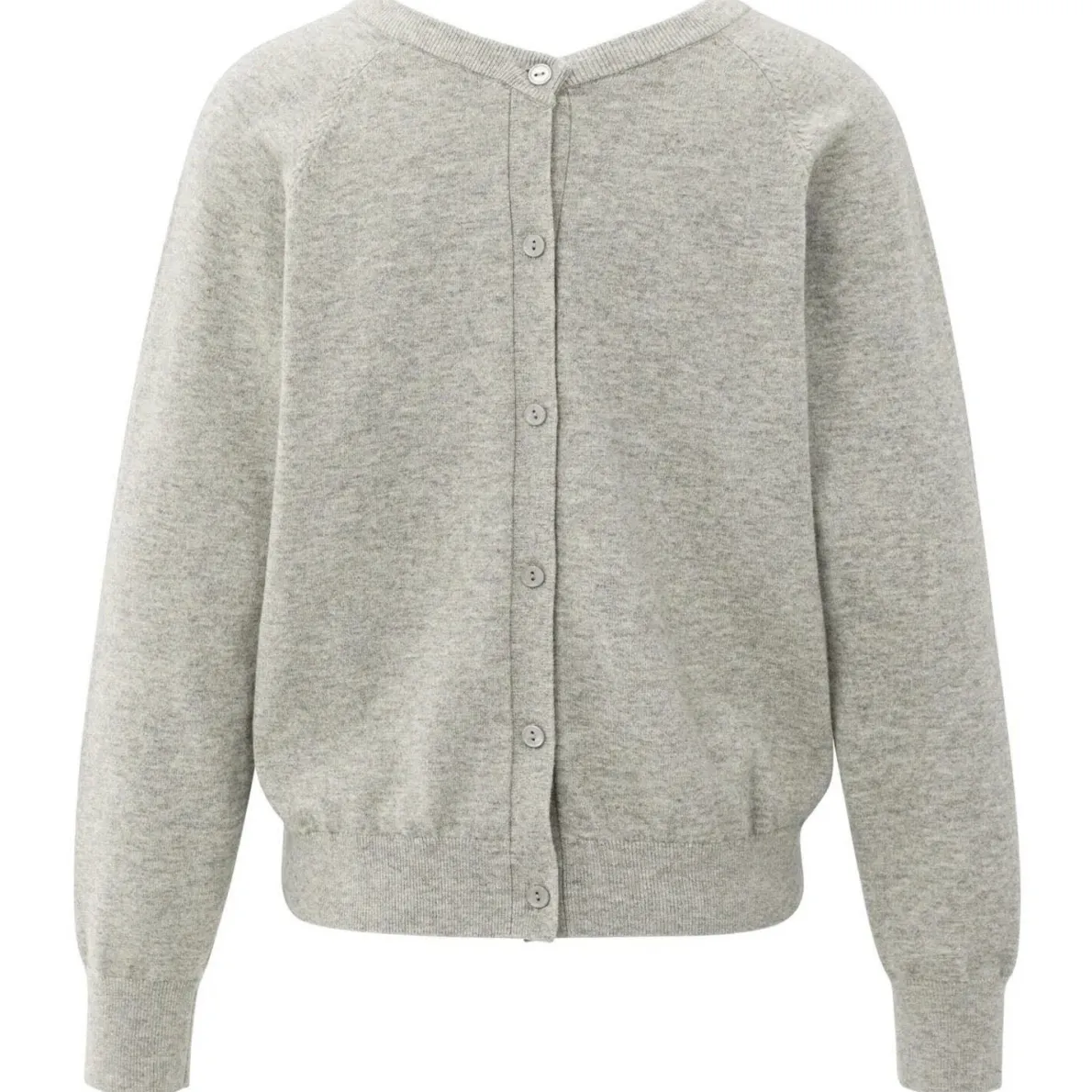 Er ist auf der Vorder- und Rückseite mit einem V-Ausschnitt gearbeitet. Auf der Rückseite ist er zusätzlich mit einer durchgehenden Knopfleiste gearbeitet, diese verleiht ihm einen besonderen Look. Er hat lange Ärmel und Rippstrickbündchen. Der gerippte Saum und die lockere Passform sorgen für einen tollen Tragekomfort.