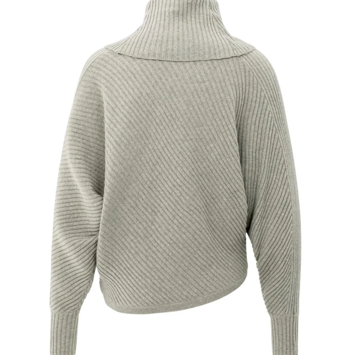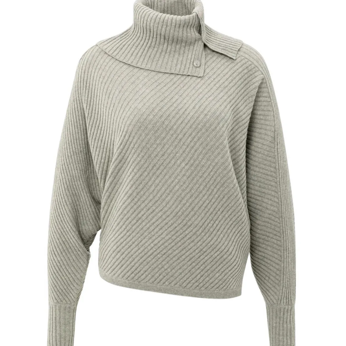 Er wurde aus weichem Rippstrick in Grau gefertigt und hat lange Fledermausärmel, welche ihm einen individuellen Look verleihen. Der hohe Kragen ist an der Seite mit einer Knopfleiste gearbeitet so kannst du ihn nach deinen Wünschen knöpfen. Die diagonale Rippung unterstreicht den modernen Look.