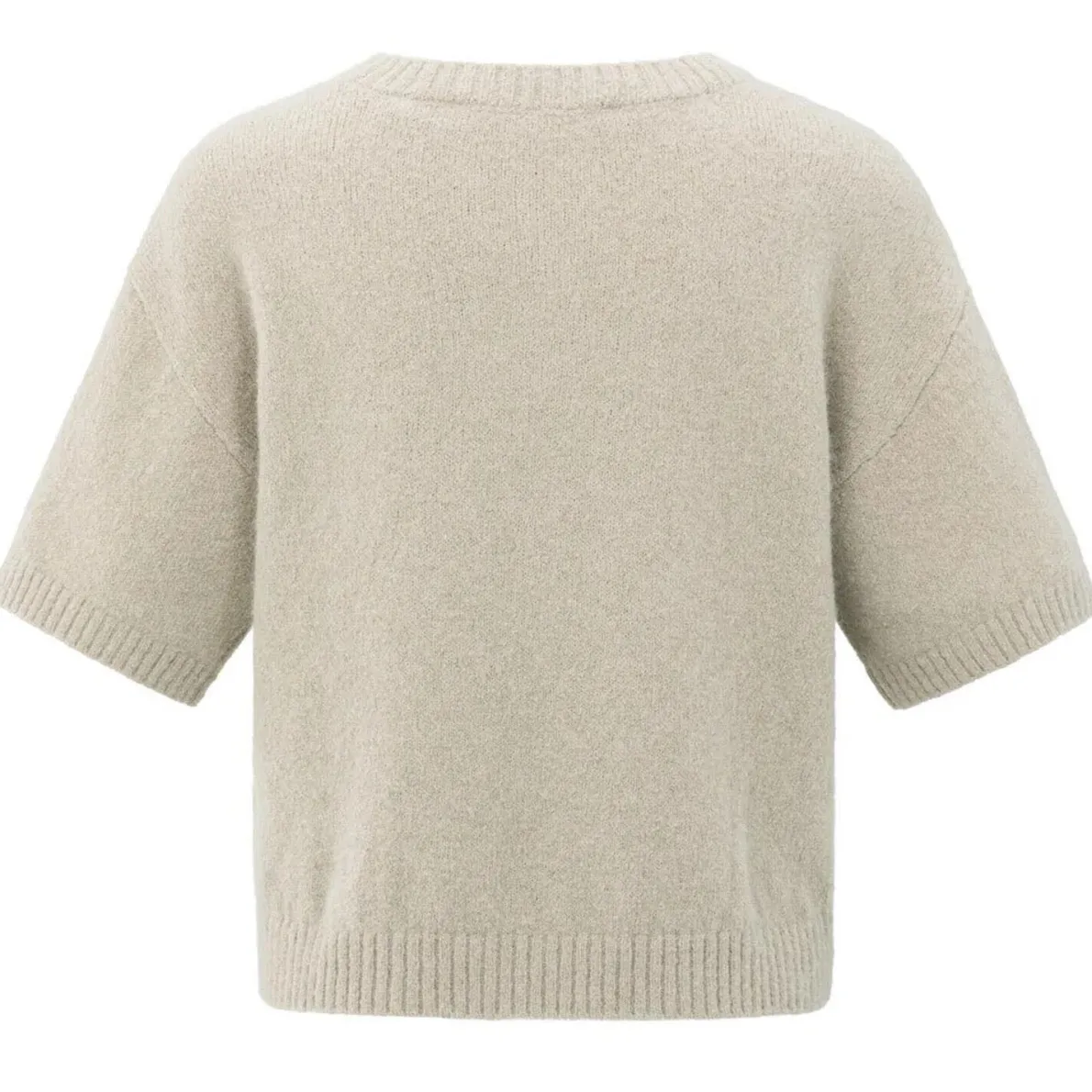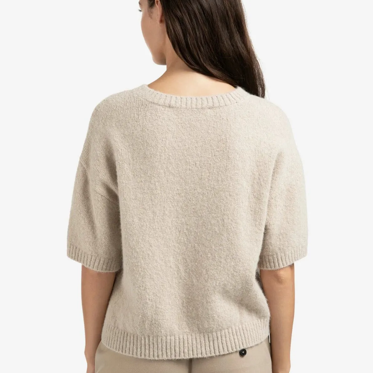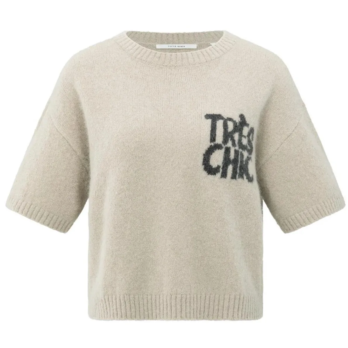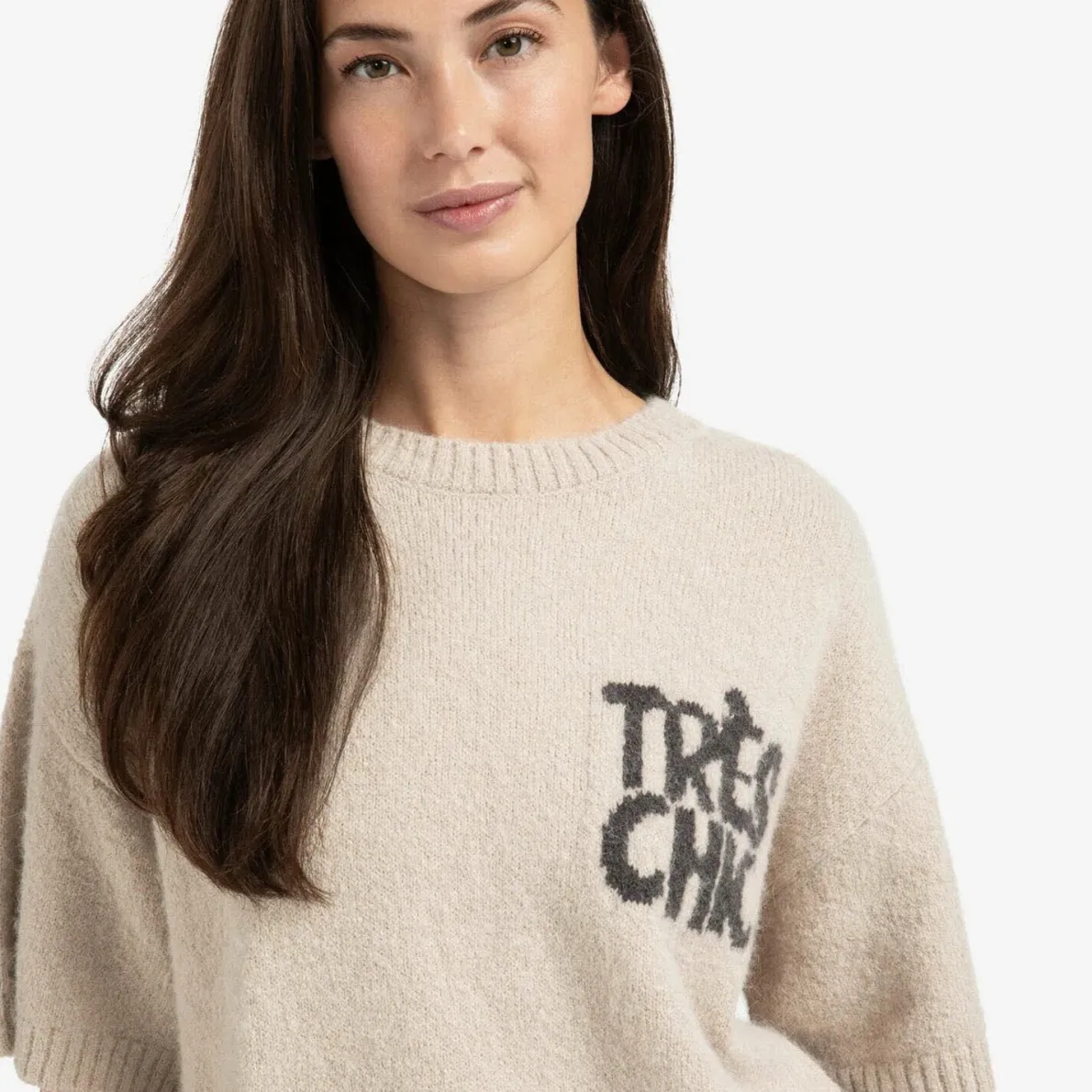 Er wurde aus einer hochwertigen Wollmischung in Beige gearbeitet. Er ist mit einem Schriftzug ‘Très Chic’ auf der Brust versehen und hat kurze Ärmel. Du kannst ihn somit auch perfekt im Lagenlook mit einer Bluse oder einem Shirt kombinieren.