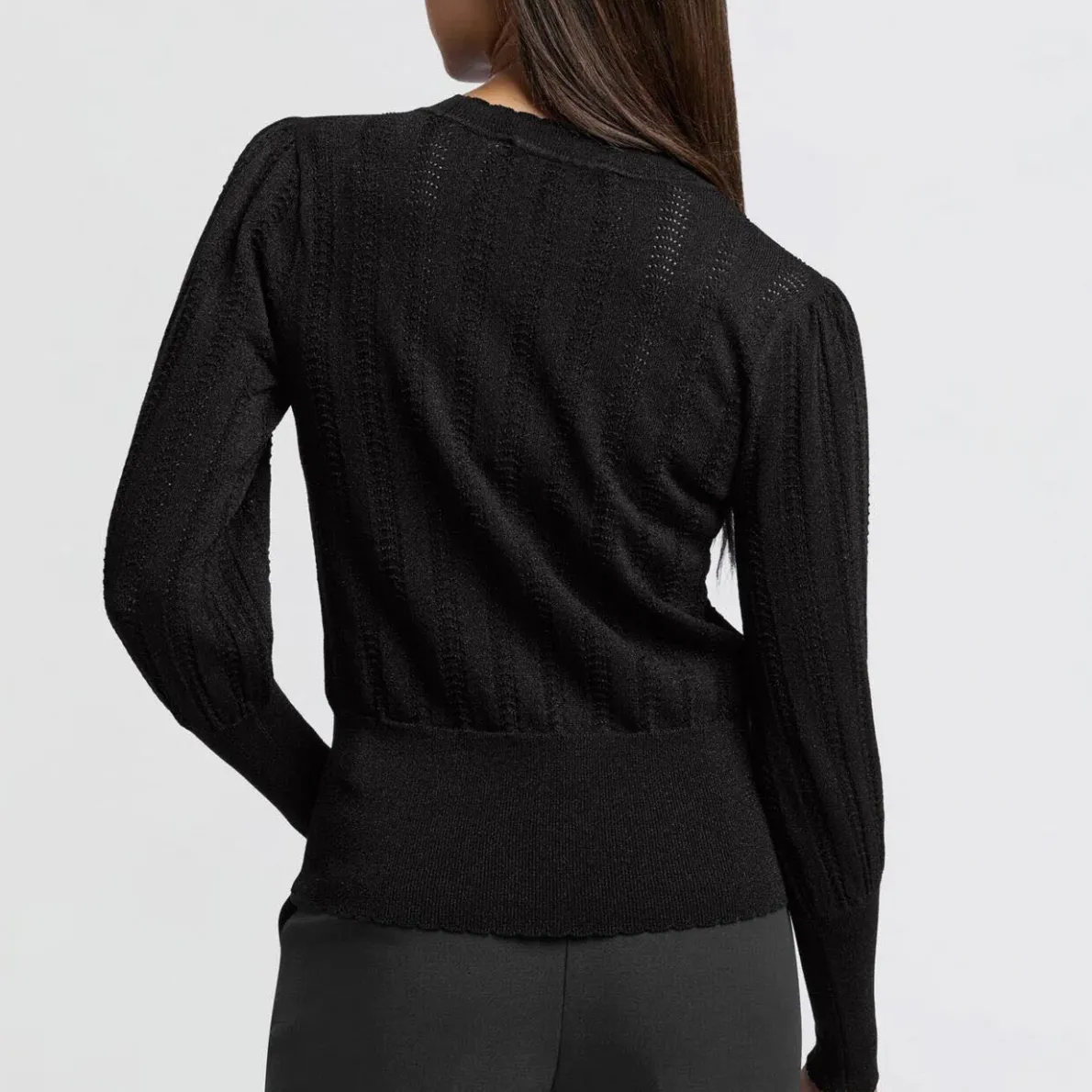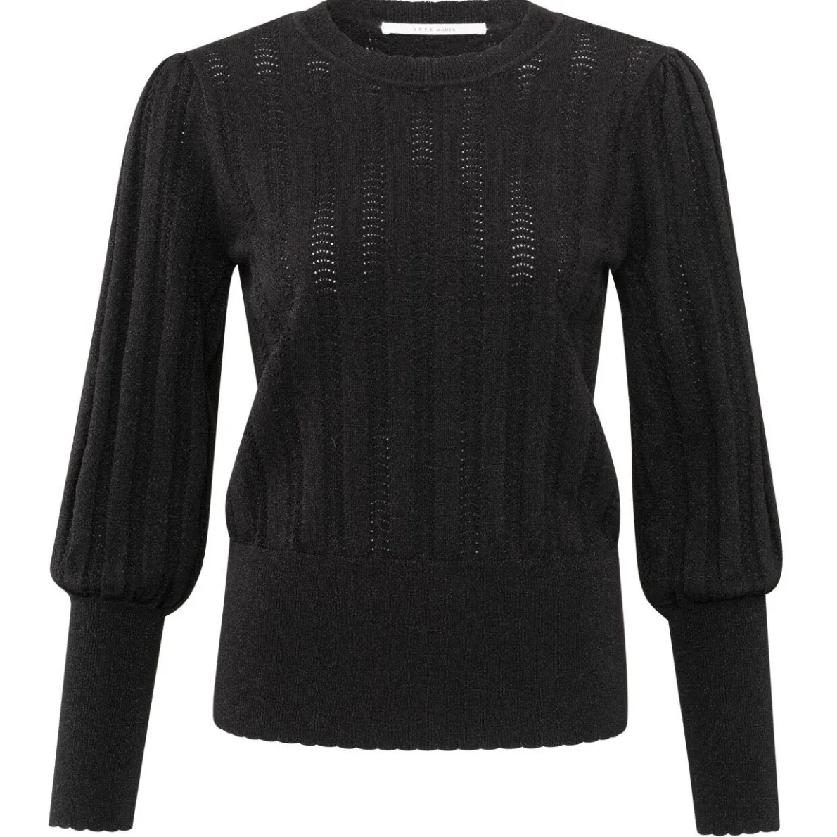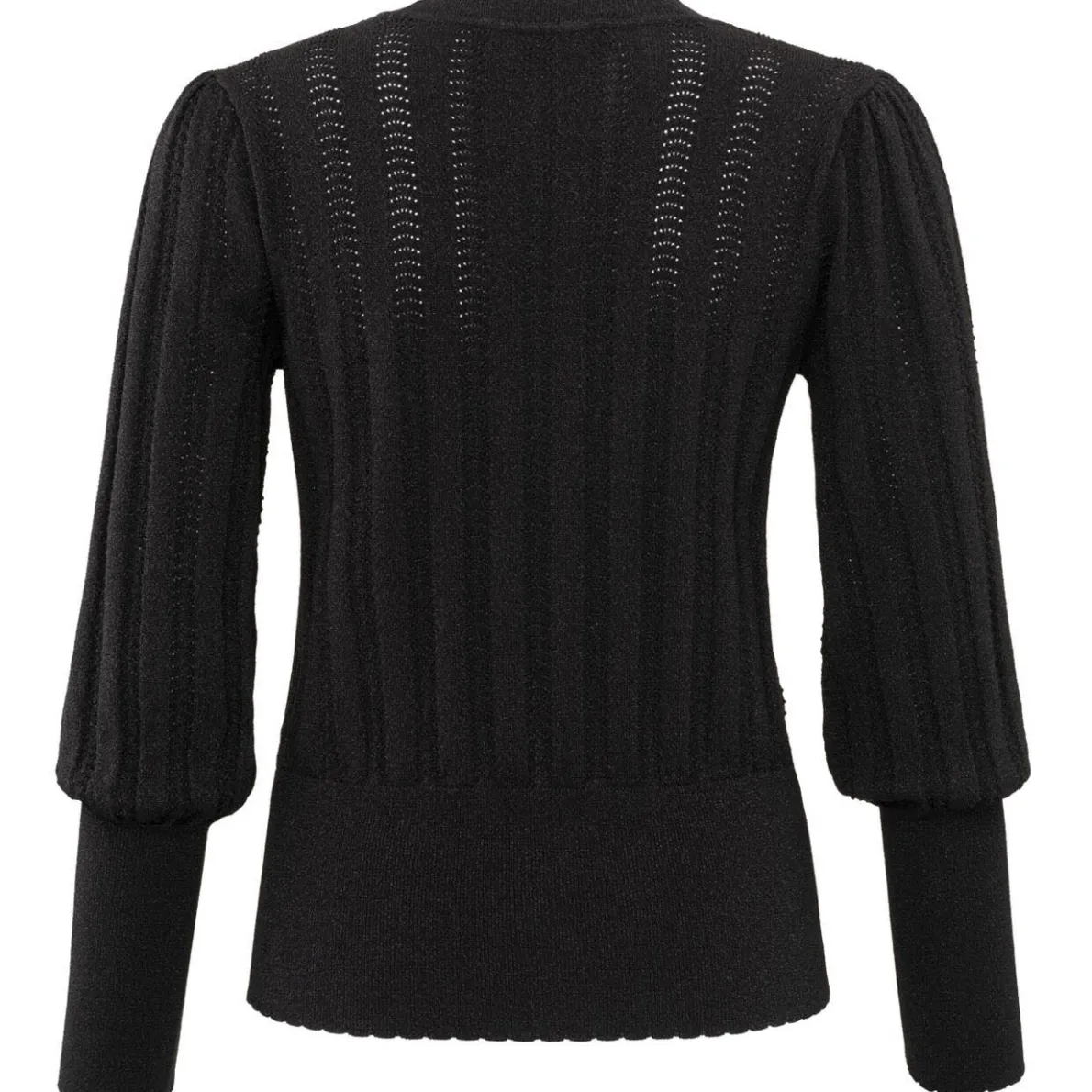 Das Strickgewebe in Schwarz ist mit dezenten À-jour-Details gestrickt und hat lange Ballonärmel. Die schmale Passform kommt durch den breiten Bund sehr schön zur Geltung. Der Pullover ist mit einem Rundhalsauschnitt gearbeitet und durch den Lurex Faden, hat er einen schönen dezenten Glitzer Effekt.