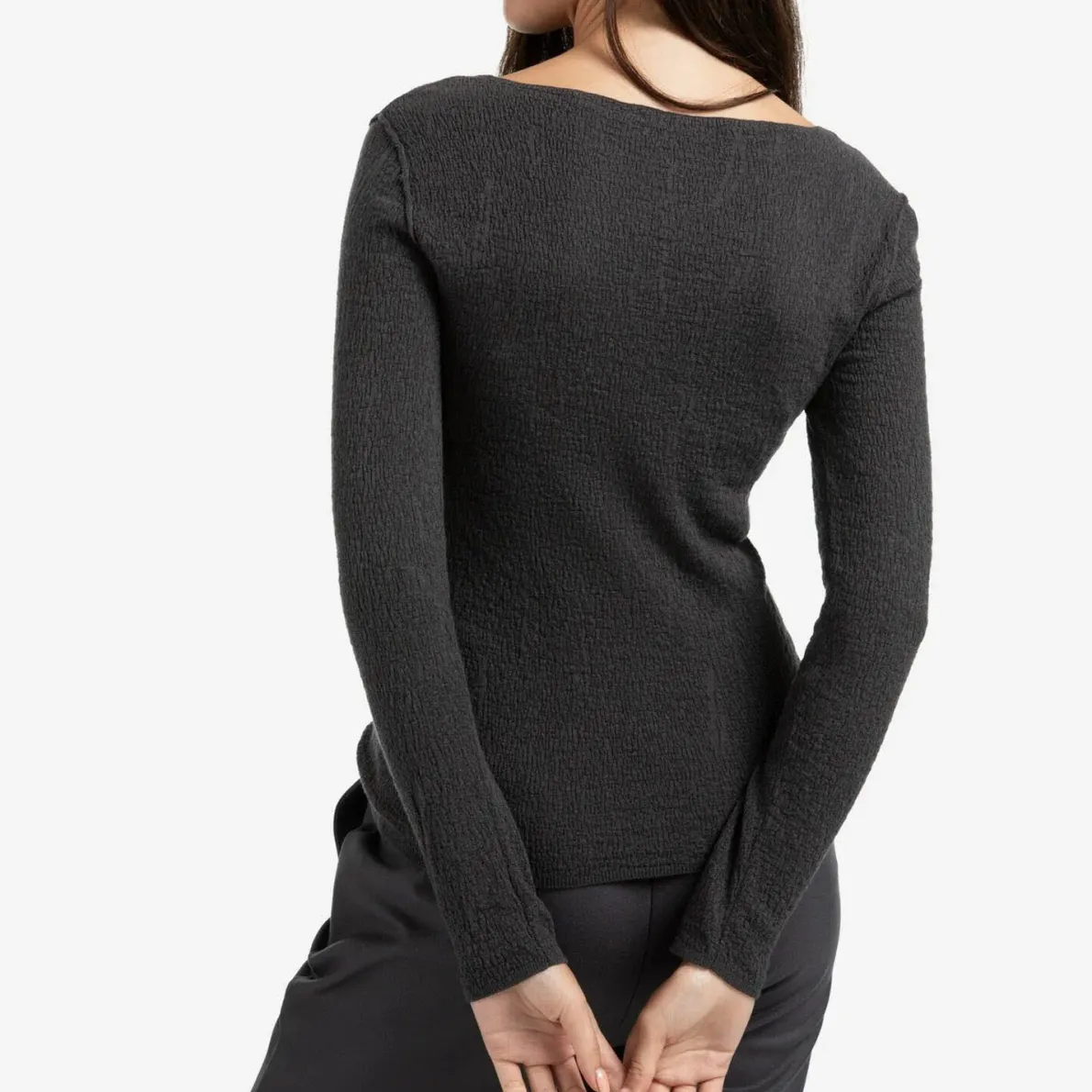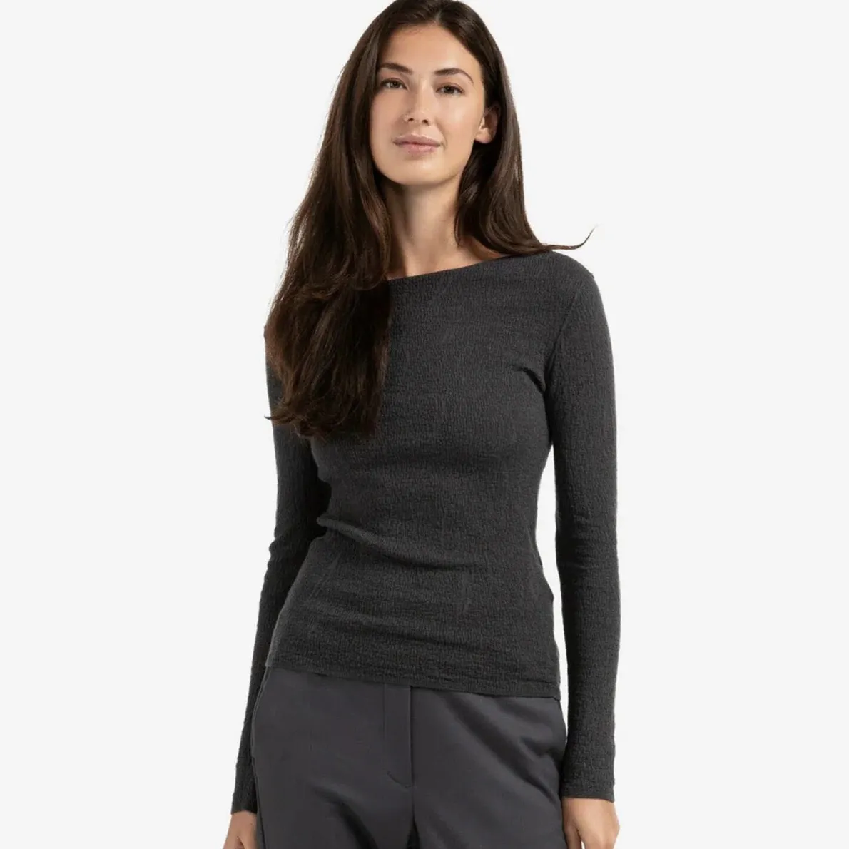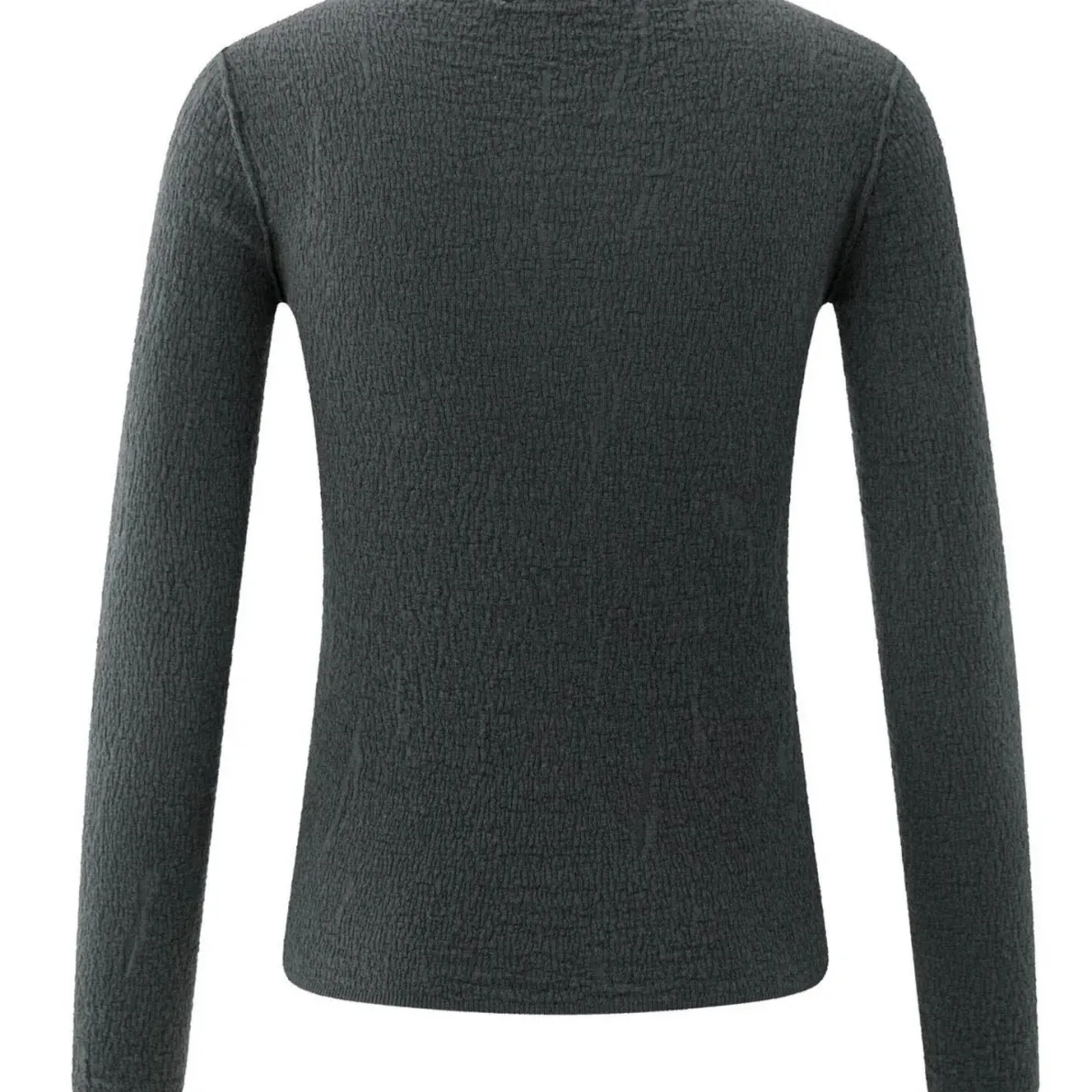 Es wurde aus einem feinen Strickgewebe in Schwarz gefertigt und ist mit einem Rundhalsausschnitt gearbeitet. Das Shirt hat lange Ärmel und eine enge Passform. Du kannst es einzeln tragen oder im Lagenlook kombinieren.