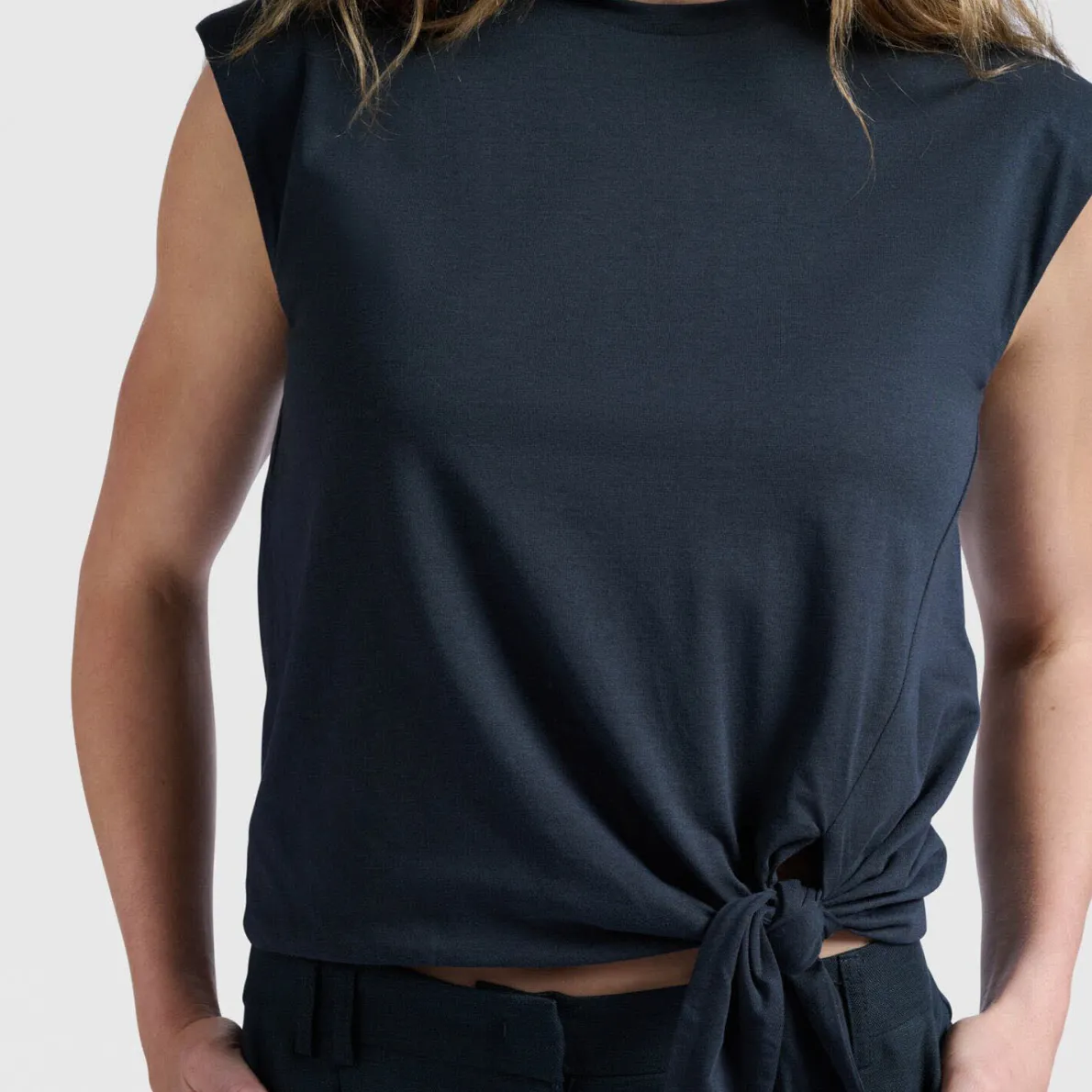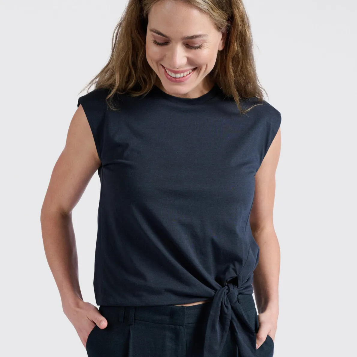 Der weiche fließende Stoff in Schwarz lässt sich angenehm tragen. Das asymmeetrische Knotendetail an der Seite, macht das Oberteil zu einem Eyecatcher. Es ist mit einem Rundhalsausschnitt gearbeitet und hat kurze Ärmel.