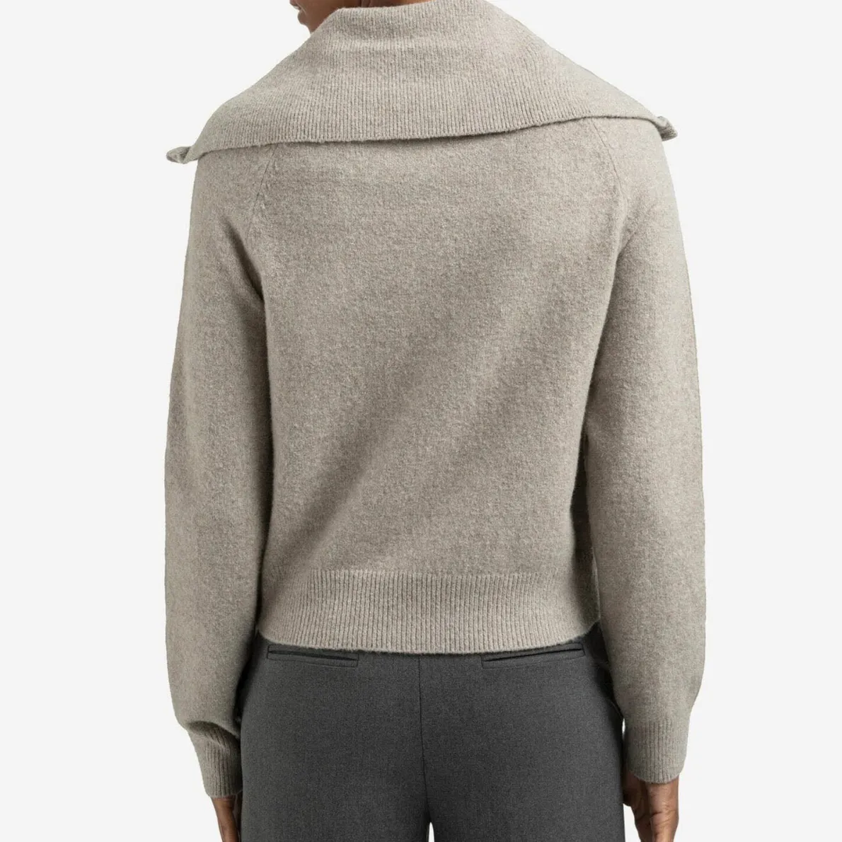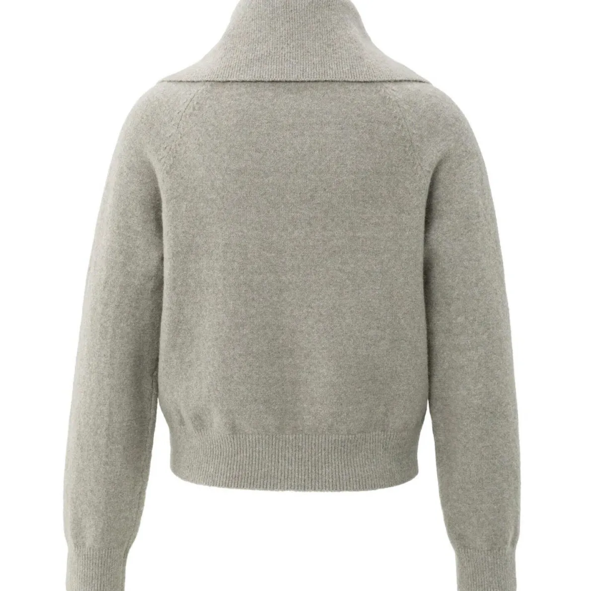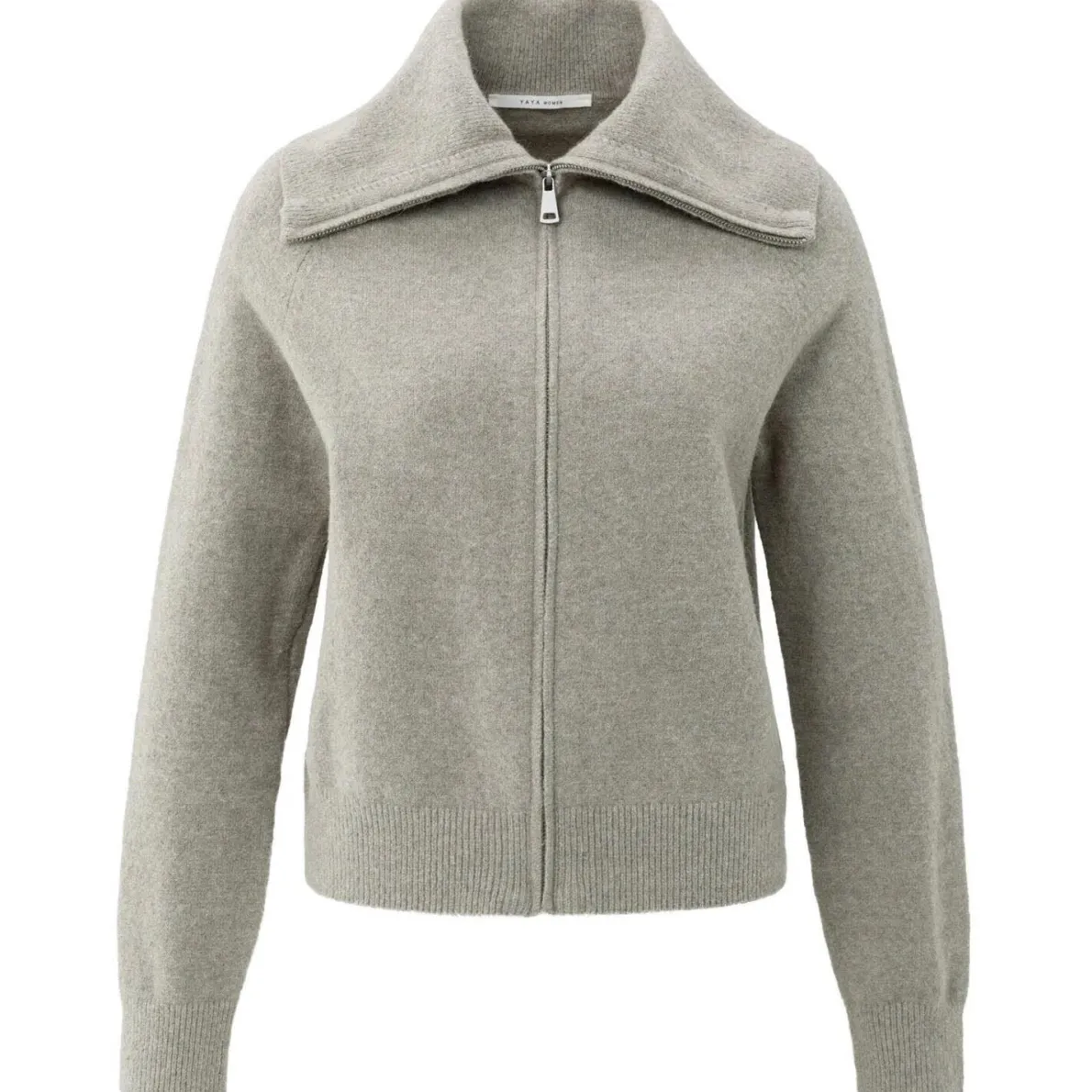 Der weiche Strickstoff in Grau ist mit einem großen, breiten Kragen gearbeitet. Dieser kann komplett durch den Reißverschluss der Strickjacke mit geschlossen werden. Der Cardigan hat lange Ärmel mit Rippstrickbündchen und kann perfekt im Lagenlook oder einzeln kombiniert werden.