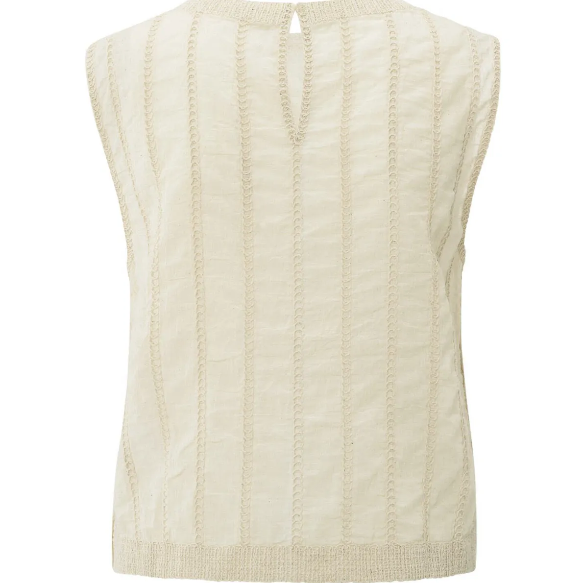 Es wurde aus einem angenehmen, leichten Stoff aus Baumwolle in Beige Creme gearbeitet. Die schöne Stickerung fällt dabei direkt ins Auge. Es ist ohne Ärmel und mit einem Rundhalsausschnitt gearbeitet. Dieser kann mit einem Knopf an der Rückseite geöffnet werden.