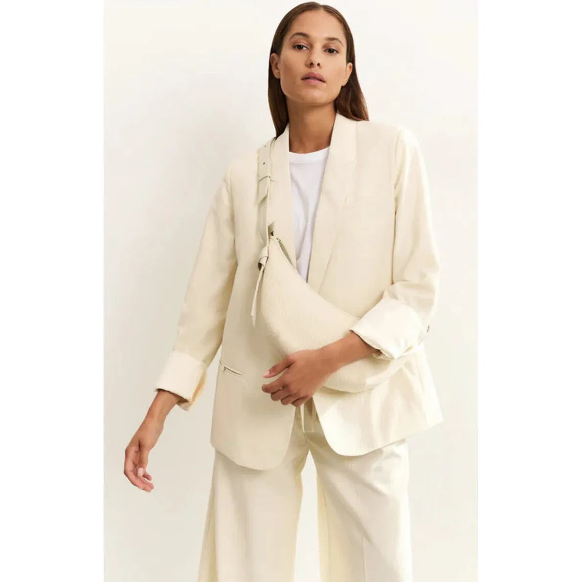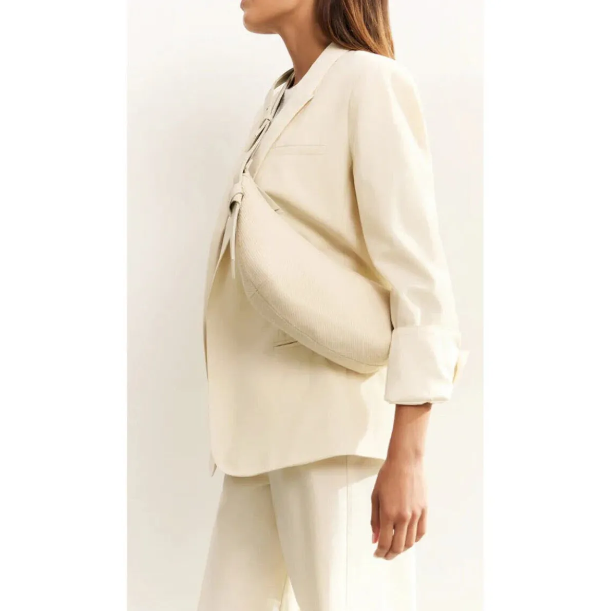 Die Schultertasche ist in eleganter Halbmondform aus robuster Baumwolle in Beige gearbeitet und verstaut alle Dinge auf die du im Alltag nicht verzichten möchtest.